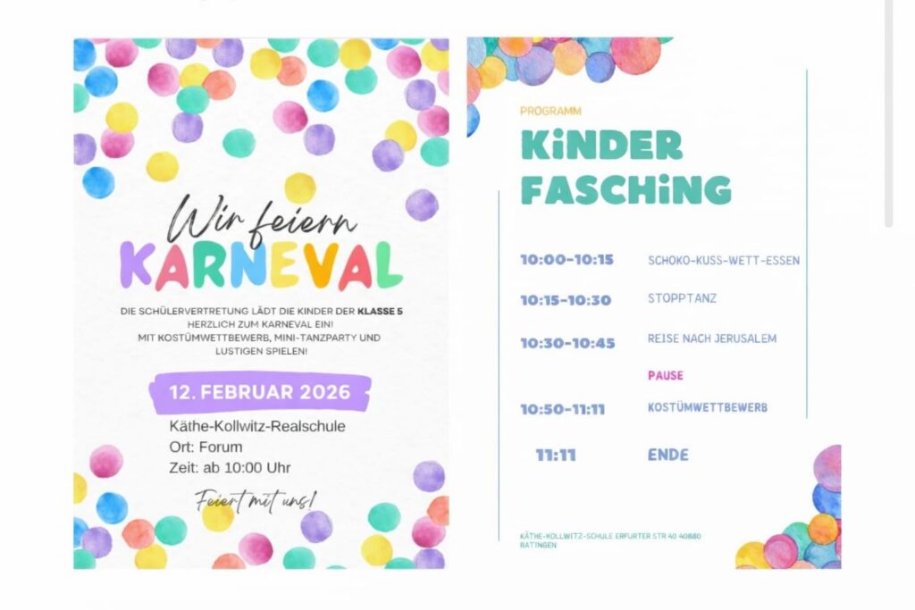 Ab 10:00 Uhr wird das Forum der Käthe-Kollwitz-Realschule zur bunten Karnevalsbühne. Die Kinder dürfen sich auf ein abwechslungsreiches Programm mit viel Spaß, Musik und guter Laune freuen. Geplant sind unter anderem ein Schokokuss-Wettessen, ein Stopptanz, die lustige Bewegungseinheit „Reise nach Jerusalem“ sowie ein Kostümwettbewerb, bei dem besonders kreative Verkleidungen ausgezeichnet werden.